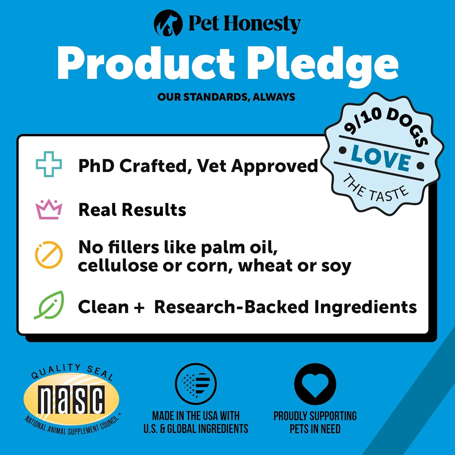 - THE HONEST DIFFERENCE: Our products are made with clean, science-backed ingredients for results you can trust, & with no fillers, artificial preservatives, colors, or flavors, you'll have no doubt your dog is getting the best. Proudly supporting pets in need nationwide & using recycled plastic in our packaging, there's also no doubt that we're committed to doing our best. -- All products are made in the U.S.A. | NASC Member Company