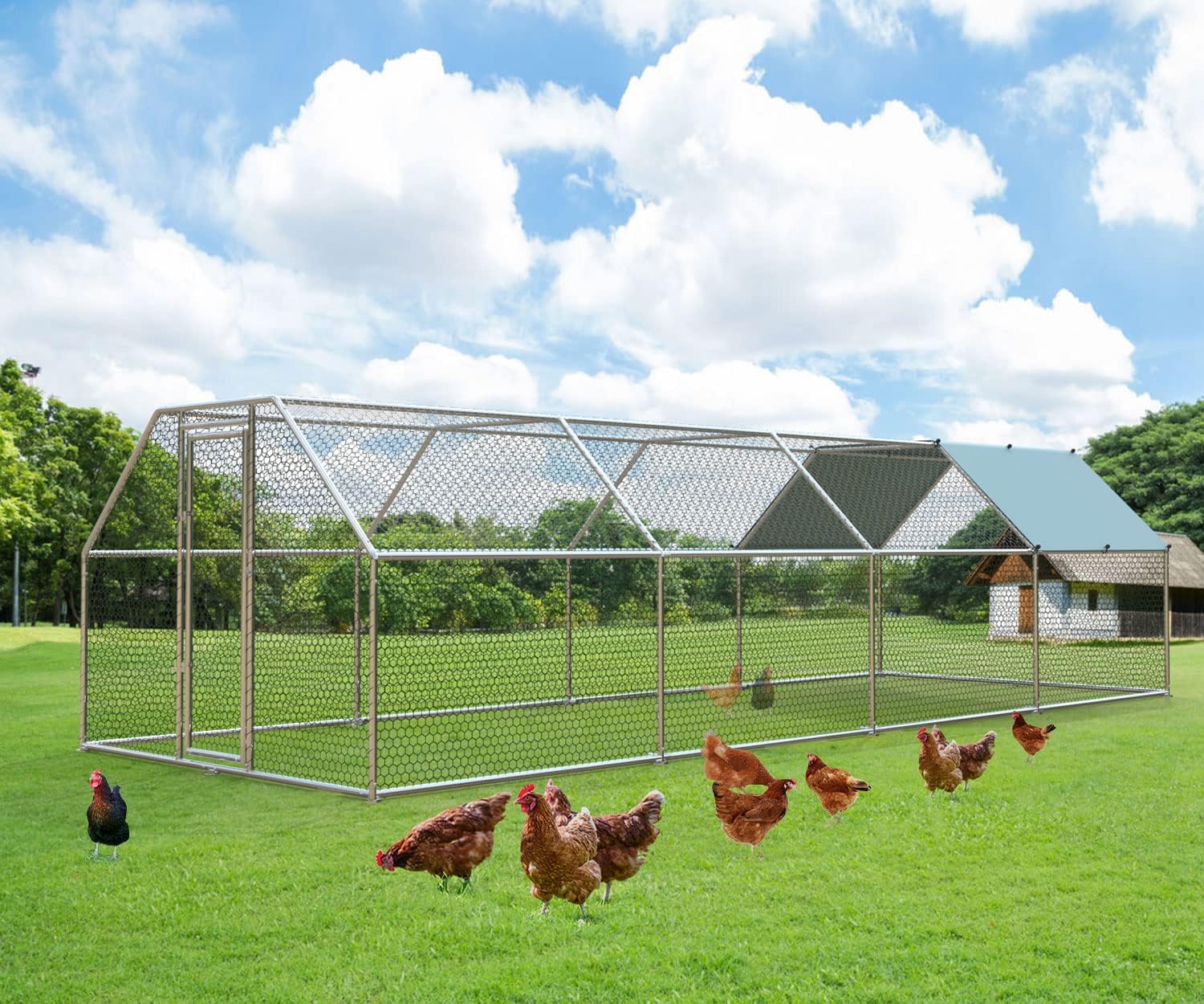 - 【Large Space for 40 Chickens】: The metal chicken coops measures 9.8'L x 25'W x 6.4'H and can accommodate around 40 chickens at a time. 6.4' height provides plenty of space for chickens to move around during the day.