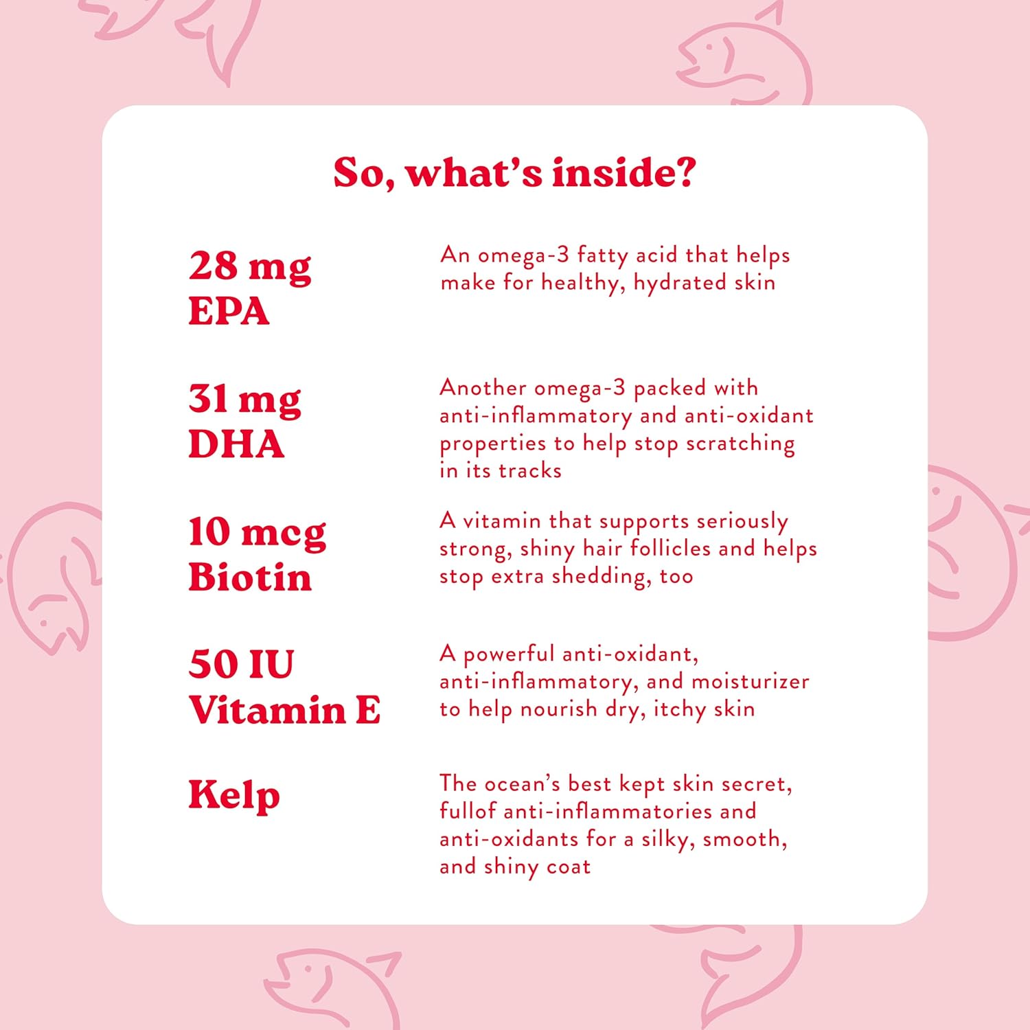 - Simple, Functional, Fun: With Wild Alaskan Salmon Oil, Kelp, and Biotin all packed into our trustworthy "B" shaped soft chews. Ohand they taste good, too!