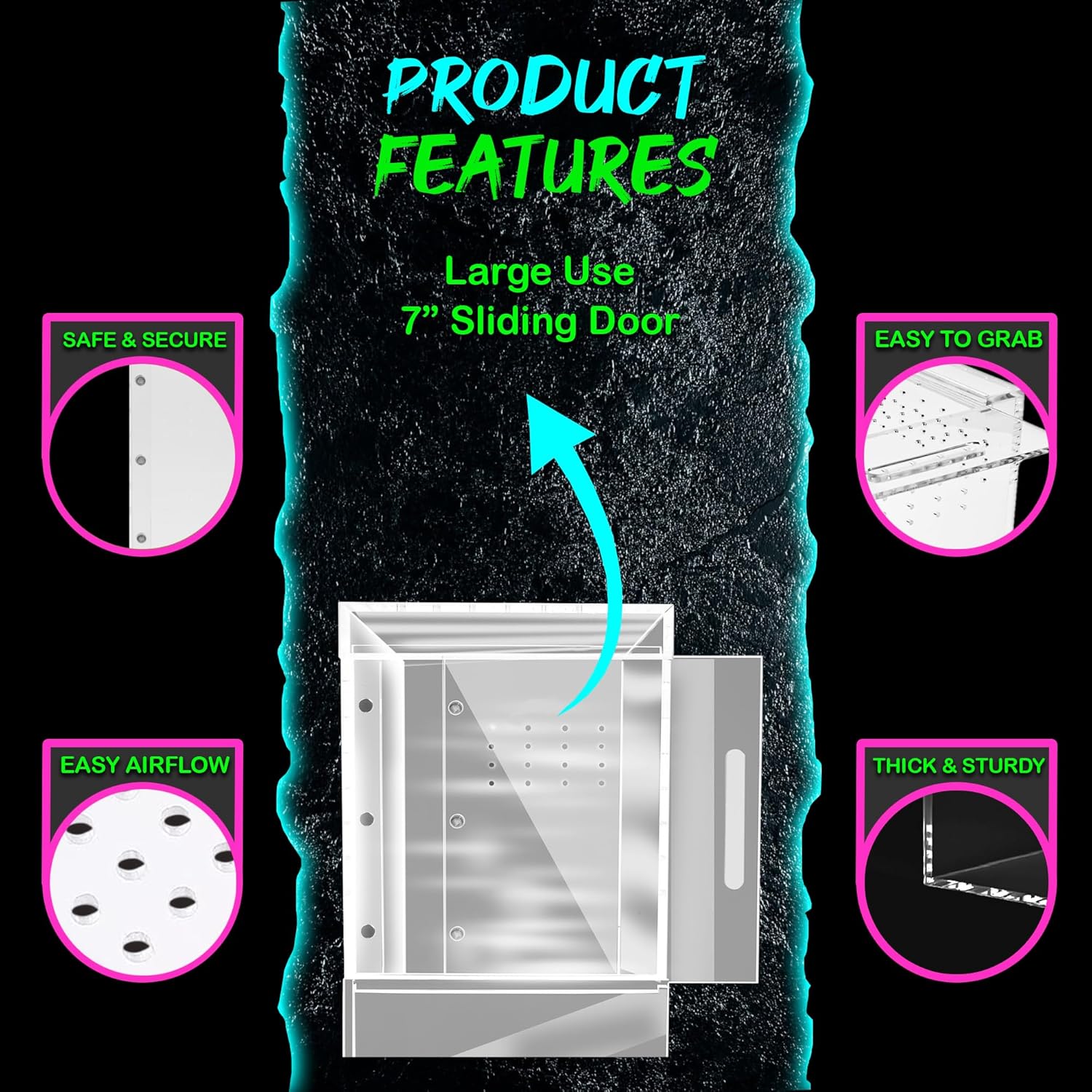 - Sliding Magnetic Doors: The sliding door along the 7” side of our reptile cage uses three magnets to keep the door tightly sealed usuing safe and strong adhesion to ensure your pet does not have an unwanted escape from our pet terrariums.
