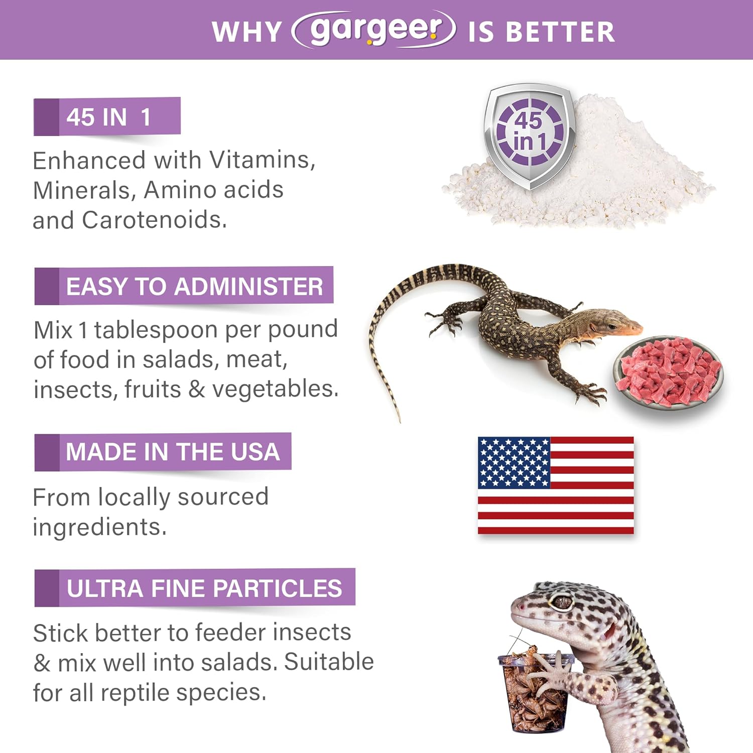 - WE MINED THEM, YOU ENJOY. Help you reptiles and amphibians maintain high level of physiological nerve functions, enzyme activities, and electrolyte balance with the help of greatly needed minerals like Potassium, Sodium, Magnesium, Iron, Zinc, Manganese, and Copper. Indoor reptiles may require supplementation since their diet might lack certain minerals found in their natural habitat.