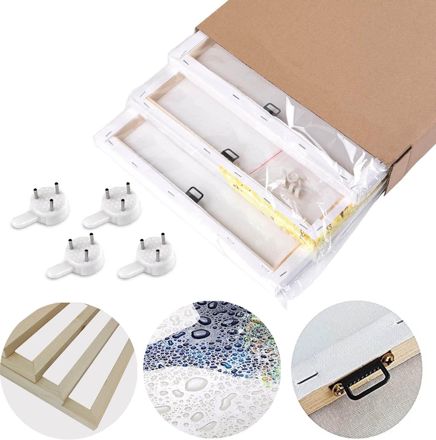 • each panel of zen decor canvas prints already stretched and framed, ready to hang. A strong hook is already fixed on each wooden inner frame for easy hanging out of box. edges are painted and each panel is wrapped by plastic bag with folded