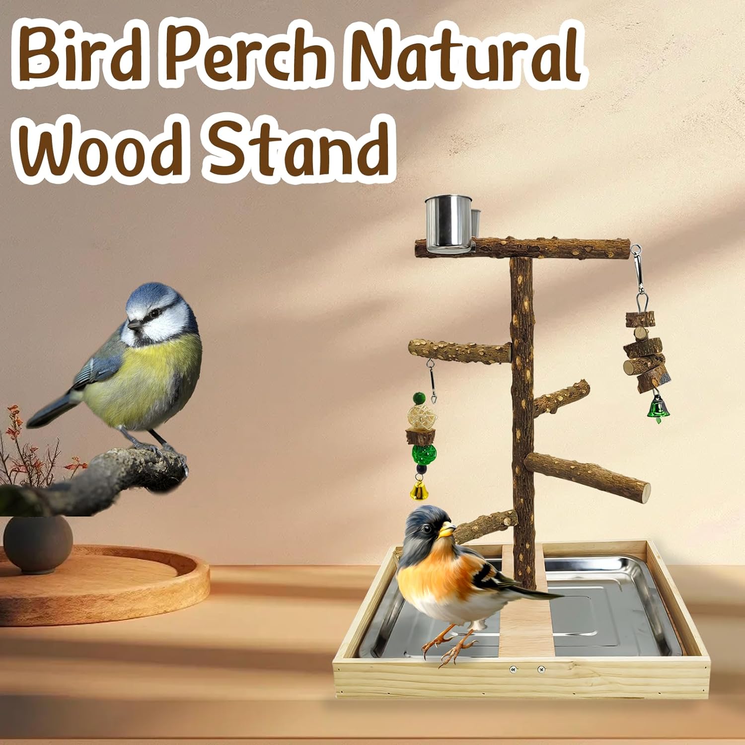 Tfwadmx Bird Perch Natural Wood Stand Toy Parrot Play Stand Platform Bird Cage with Removable Tray and 2 Stainless Steel Cups for Parakeets Canaries Cockatiels Conure Lovebirds