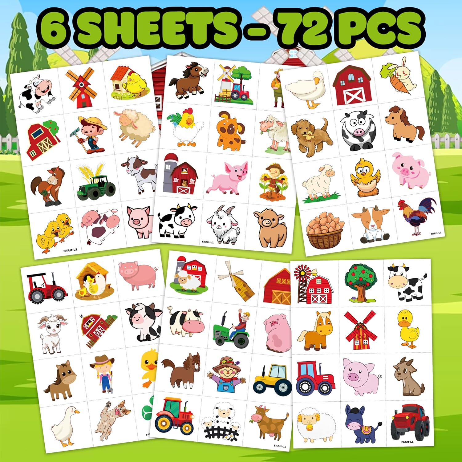 - 🐄TATTOOS FOR FARM BARNYARD ANIMAL THEMED DECORATION: FARM DIE-CUT TATTOOS for people who love farm, farmhouse , Animal. Featuring 6 sheets with 72 pcs of lovely, fun and colorful design: Cow, pig, horse, tractor... Each sheet measures 6.3 * 4.7 inches. You can temporarily tattoo them on your body or objects such as phones, bottles, laptop…