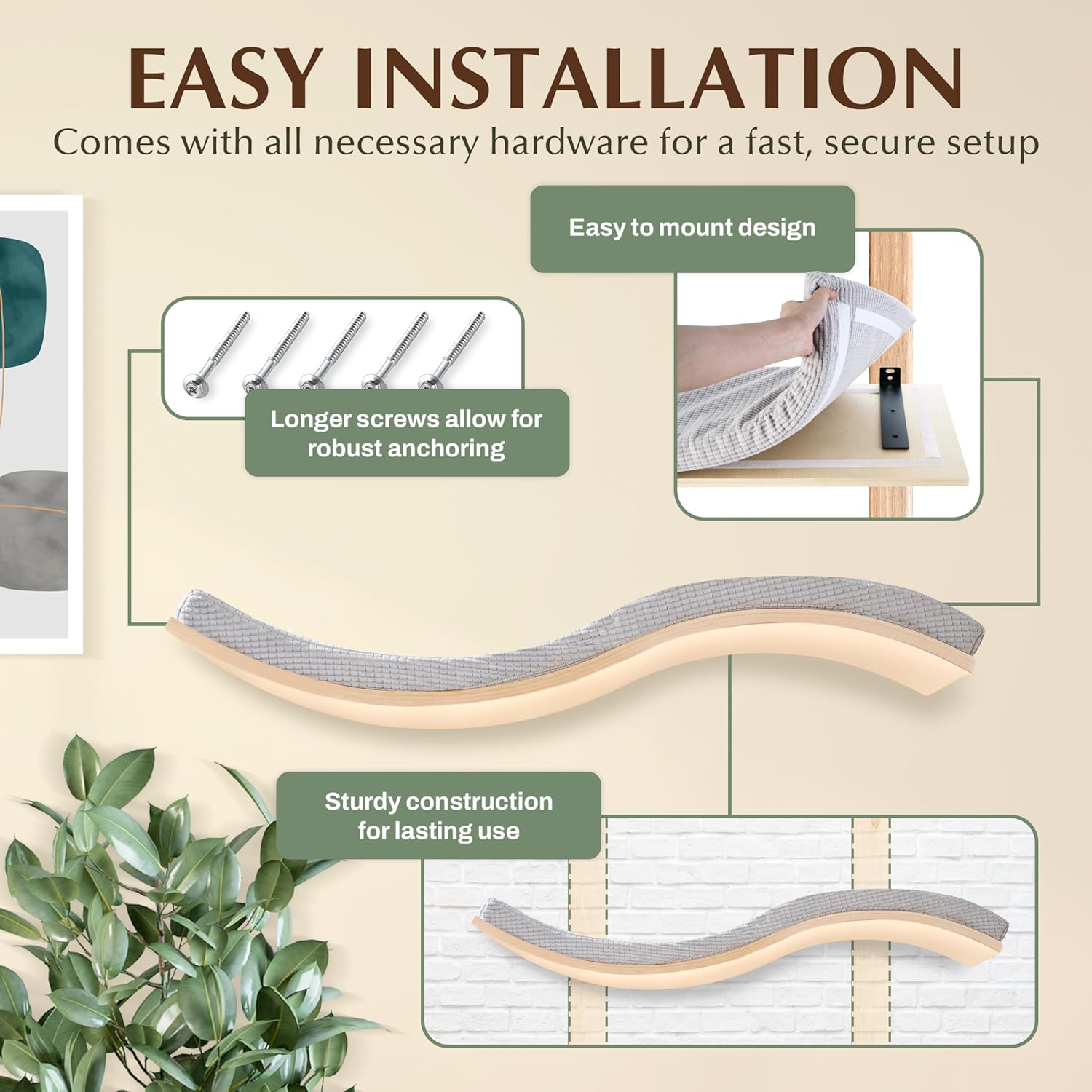 - SLEEK DESIGN, HIDDEN MOUNTS & MACHINE WASHABLE COVER - Made from high-quality wood, this cat wall perch features a sleek modern aesthetic look. It also features hidden mounts and a soft foam cushion with a fabric cover, ensuring both comfort and durability. The machine washable fabric prevents slipping and makes cleaning a breeze, keeping your wall cat bed fresh and ready for lounging. It’s the ideal choice for a cat wall hammock or cat perch wall for your indoor cat.