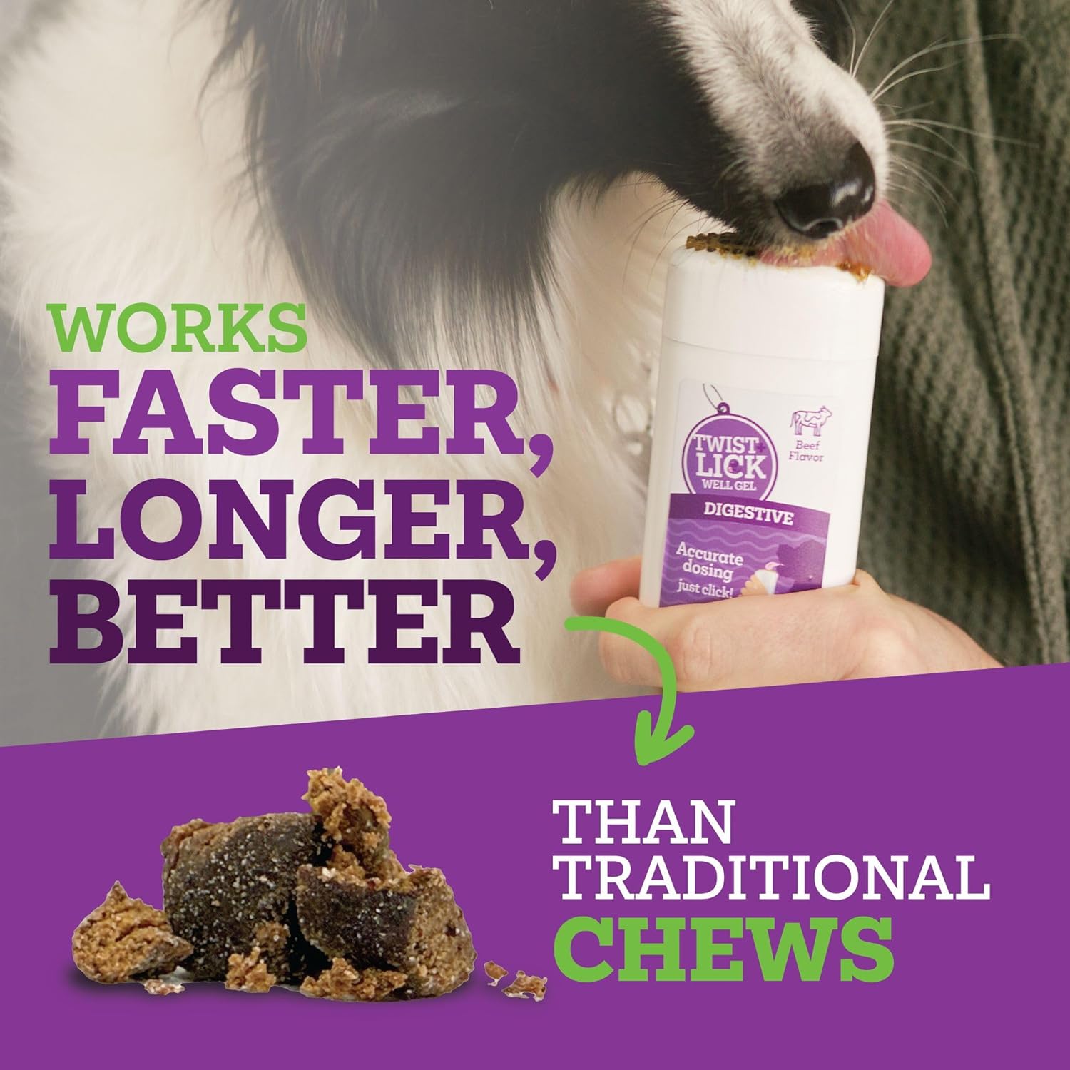 - Twist + Lick Digestive works fast by adhering to mucosal lining and releasing active ingredients into the bloodstream right away. That’s a fancy way of saying it sticks around in the mouth instead of going right to the digestive system. So, your pup gets the hip and joint relief it needs lightning fast.