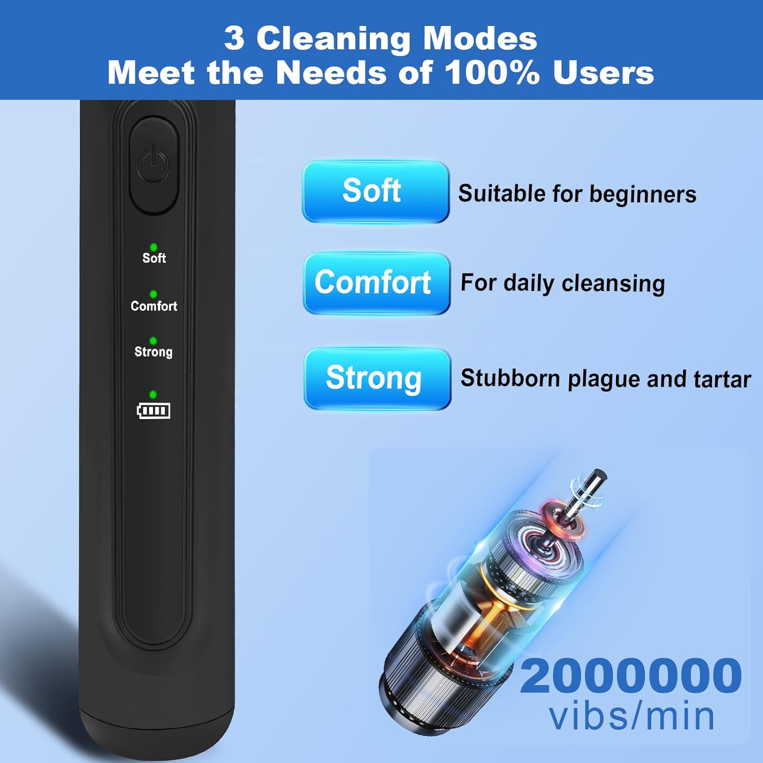 - Easy to Use & Complete Kit : Three modes (soft, comfort, strong) suit needs—start with soft for first use. A button press reduces buildup. It includes an ultrasonic cleaner, 2 heads, a dental probe, and a wrench for home care