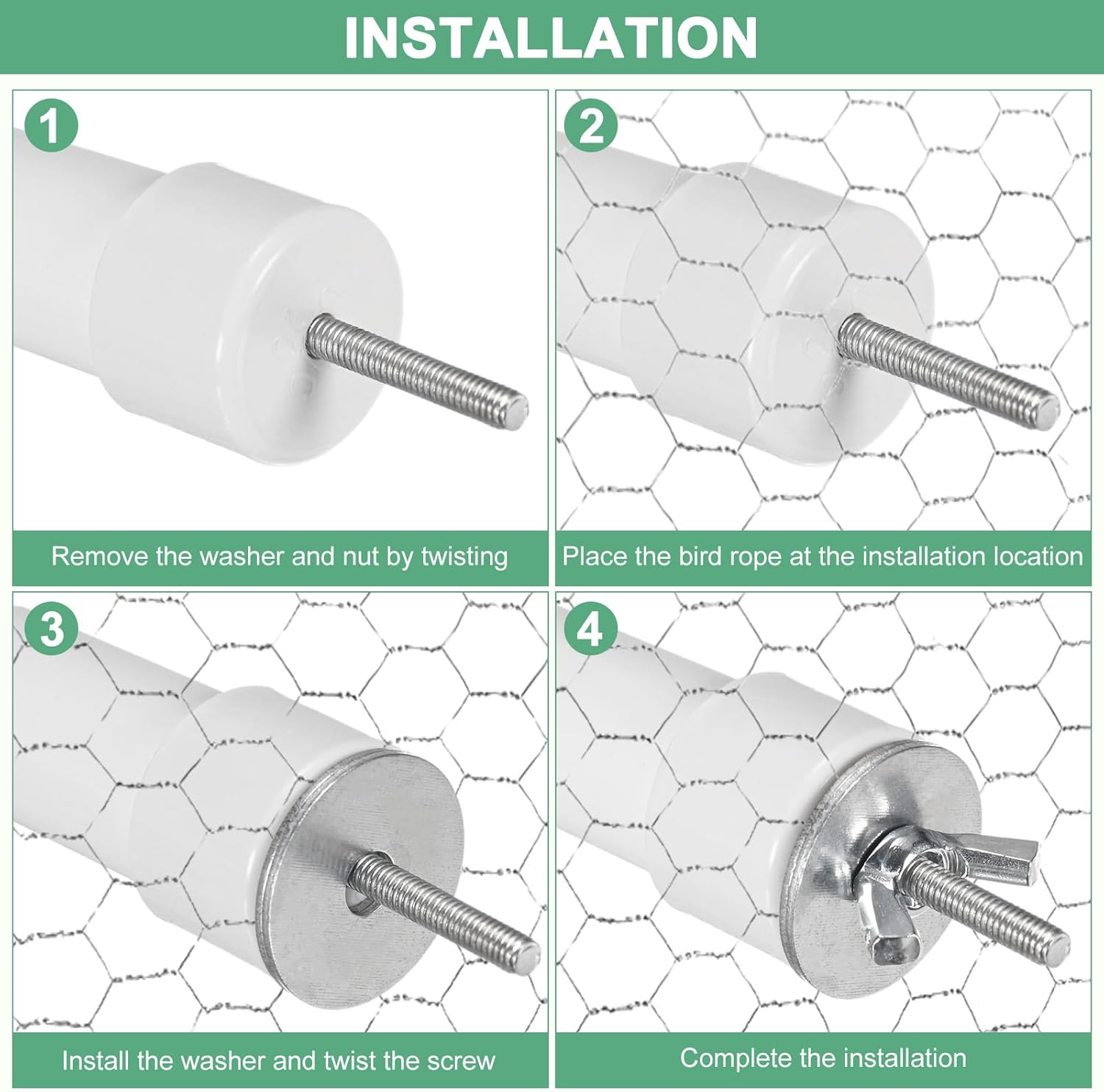 - [Attention] - It can be easily installed on the bird cage without any tools. Adjust the perch rope to the desired shape, unscrew the nuts at both ends, clamp the perch rope on the bird cage, and tighten the nuts to install it