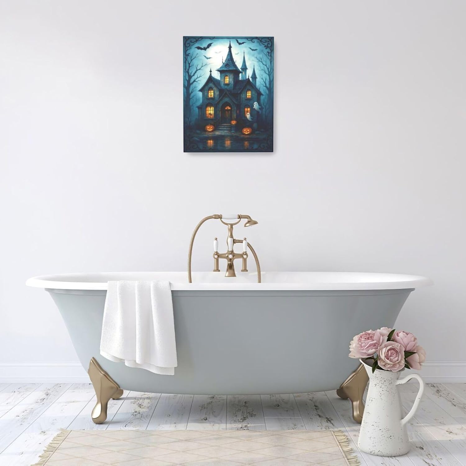 Halloween Gothic Wall Art Castle Pumpkin Ghost Bat Canvas Wall Decor Dark Academia Pictures Painting Print Framed Artwork Decorations Gifts for Halloween Living Room Bedroom Office 16"x20"
